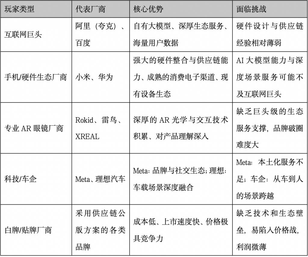 当前的 AI 眼镜市场已形成多元化的竞争格局,主要玩家可分为以下几类,各自具有鲜明的优势和挑战,其竞争焦点已从单纯的硬件参数比拼,转向“ AI 大模型能力 + 场景生态 + 用户体验”的综合较量。